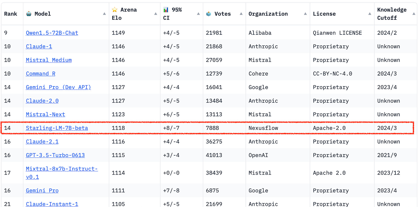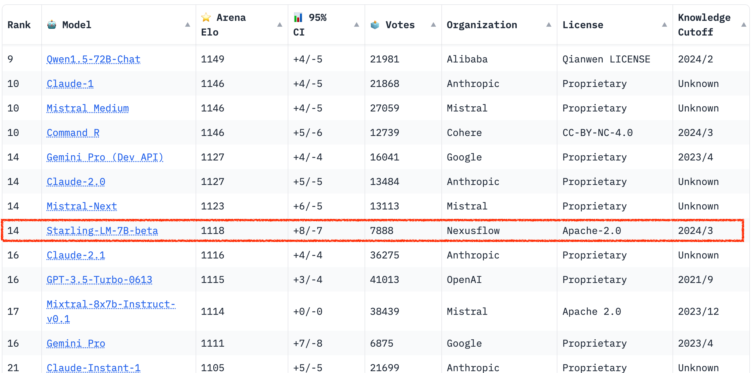 上週我們才介紹了 Mistral 7B v0.2 基礎模型的發布,這週在 Chatbot Arena 上關注到的是另一個輕量級語言模型 Starling-LM-7B-beta。這是由 UC berkeley 開發的開源大型語言模型,主要特色是 RLAIF(Reinforcement Learning from AI Feedback)功能,能夠從與人類交互中學習並改進,實現利用AI反饋結果進行增強式學習。