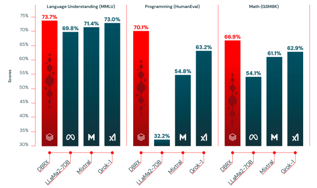 第二個看到的大型語言模型是由數據平台 Databricks 推出的 DBRX ,下圖的評測顯示在語言理解 (MMLU)、寫程式 (HumanEval) 和數學 (GSM8K) 方面超越了現有的開源模型。